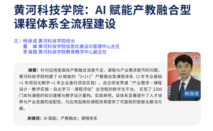 该文章既是我校相关改革实践获评河南省首批“人工智能赋能教育高质量发展高效能治理”典型案例的理论凝练与集中展示,也是对我校“人工智能+教育”系统性改革的深度解读与学术表达。不仅总结了我校在建立产业人才需求数据标准、建设产业需求调研智能体、开发一体化数字化平台及深化AI技术教学融合应用等方面的具体举措,还从理论层面剖析了“数据驱动、精准教学”的智能实施逻辑与课程质量持续优化机制,为深化产教融合课程改革提供了兼具理论高度与实践可操作性的“黄河科技学院方案”。